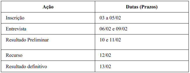 A seleção será realizada por análise curricular e entrevista. As inscrições estarão abertas no período de 03 a 05 de fevereiro e serão realizadas exclusivamente por meio eletrônico https://forms.gle/ouHRYhyQVxPb8NjP6.